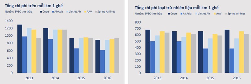 So sánh tổng chi phí trên mỗi km/ghế của các hãng hàng không. Nguồn: BVSC tháng 1/2018 |