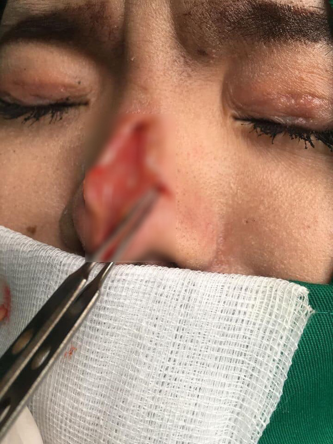Phần sụn nâng mũi của cô gái này bị lòi hẳn ra bên ngoài, để lại một chiếc lỗ trống hoác đáng sợ.
