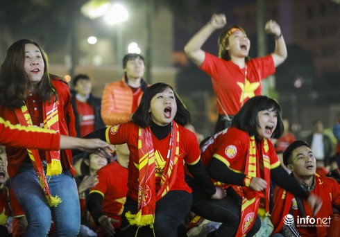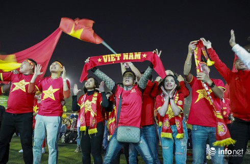 Các cổ động viên trong sắc đỏ nhiệt tình cổ vũ, reo hò mỗi khi Việt Nam có bóng.