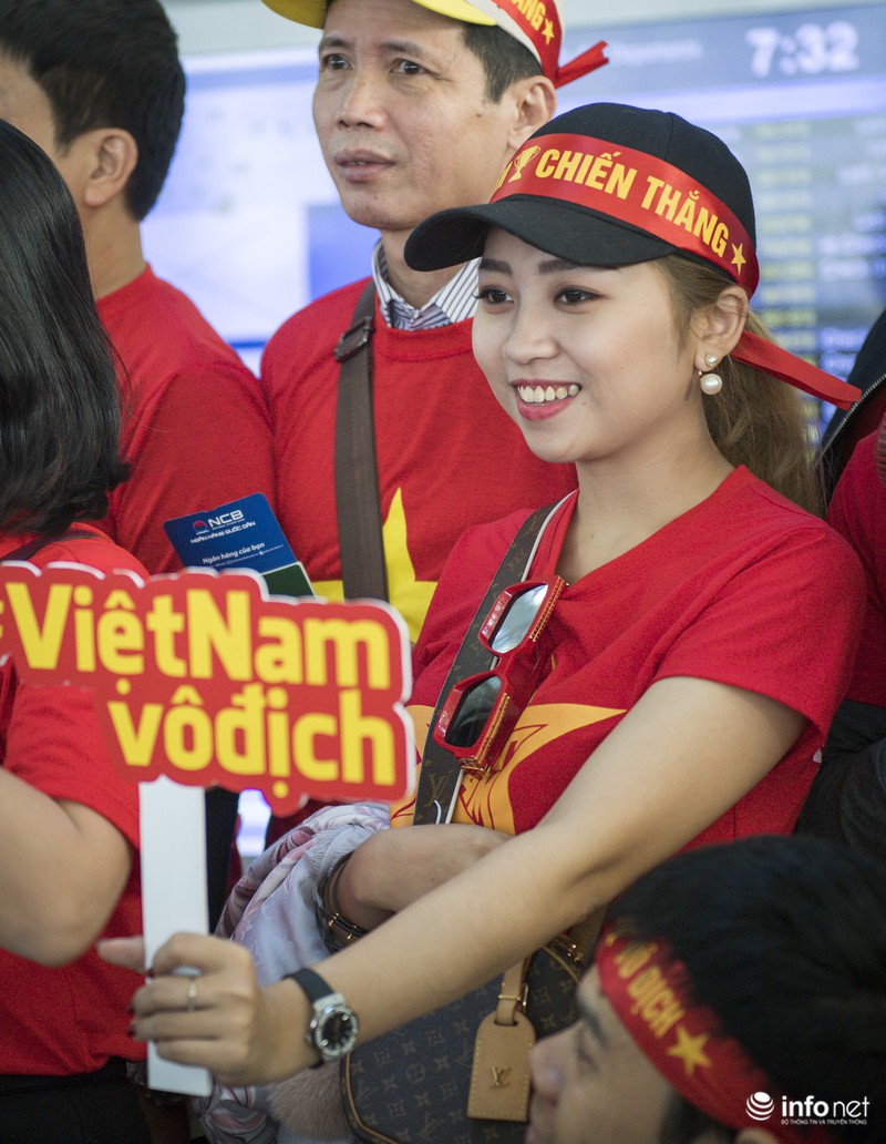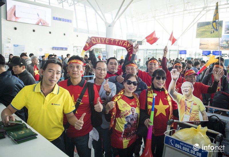 Theo ghi nhận của nhóm PV Infonet, tại khu vực check-in sân bay quốc tế Nội Bài, hàng ngàn cổ động viên trong trang phục áo cờ đỏ sao vàng đã nhuộm đỏ sân bay, sẵn sàng đáp chuyến bay thẳng sang thủ đô Manila (Philippines) cổ vũ cho ĐT U22 Việt Nam.