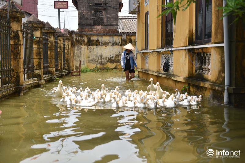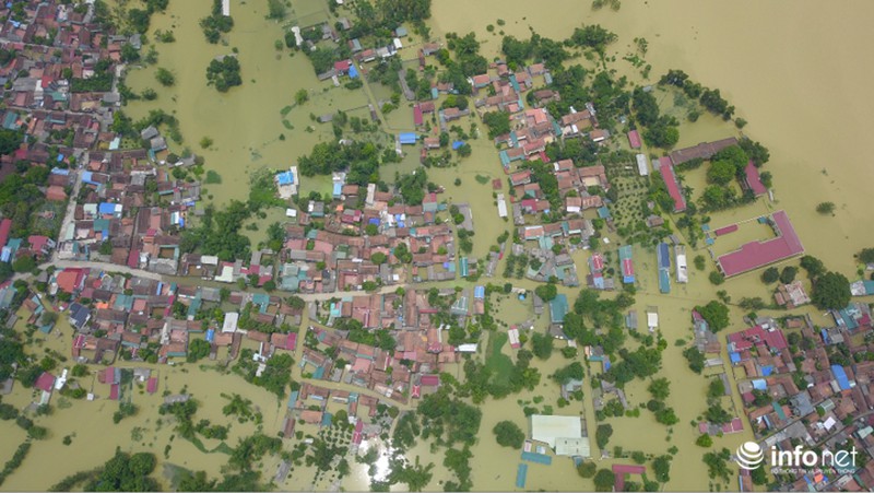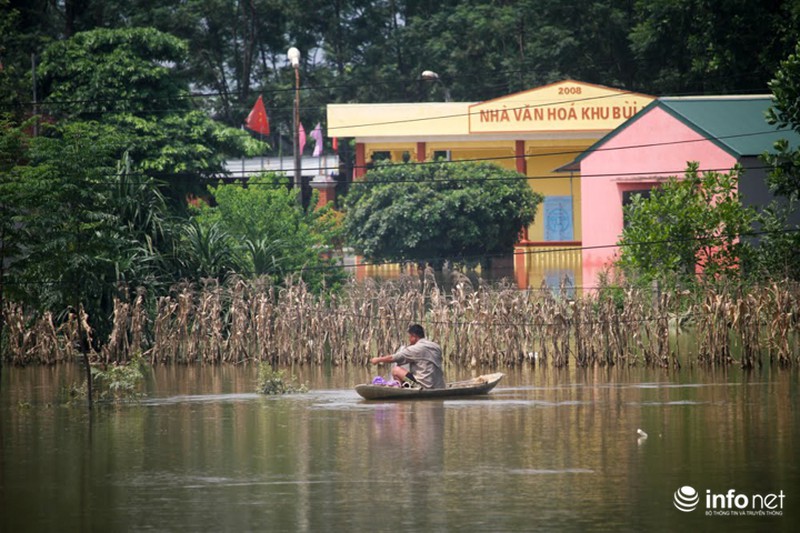 Nước lũ nhấn chìm tất cả các ngôi nhà trong thôn, có nơi nước dâng cao ngập đầu người. Ngay trước nhà văn hóa thôn Bùi cũng mênh mông biển nước |
