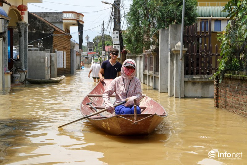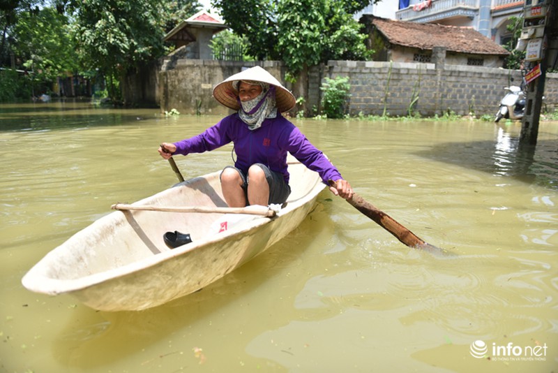 Không riêng gì thôn Bùi Xá, nhiều ngày nay, người dân xã Nam Phương Tiến cũng phải sử dụng thuyền để làm phương tiện di chuyển quanh ngõ xóm. |