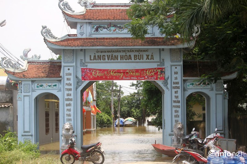 Mặc dù mấy ngày nay Hà Nội không còn mưa nhưng ở thôn Bùi Xá (thị trấn Xuân Mai, huyện Chương Mỹ) vẫn ngập sâu trong nước lũ. |