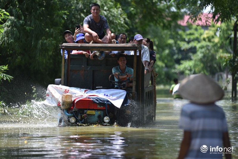 Cùng cảnh với thôn Bùi Xá, phần lớn diện tích xã Nam Phương Tiến vẫn ngập trong nước do ảnh hưởng của đợt mưa lũ nhiều ngày qua. Phó Chủ tịch UBND xã - Nguyễn Chiến Thắng cho biết, từ ngày 17 - 21/7, nước sông Bùi lên cao nhấn chìm các ngôi làng tại đây. |