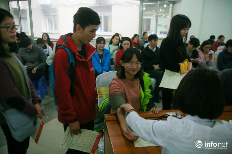 Lượng người đổ về Viện Huyết học hiến máu đông lên từng giờ. Không ít người phải chờ từ 15-30 phút mới đến lượt khám sức khỏe, kiểm tra máu.