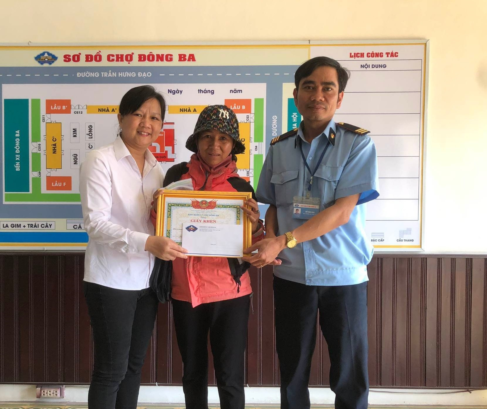 Chiều 10/2, bà Hoàng Thị Như Thanh – Trưởng Ban quản lý chợ Đông Ba cho biết, đơn vị vừa tiến hành trao giấy khen và tặng thưởng cho chị Trần Thị Thu Hà (hành nghề bán vé số dạo) vì hành động không tham của rơi.