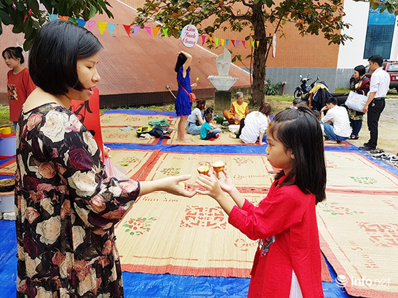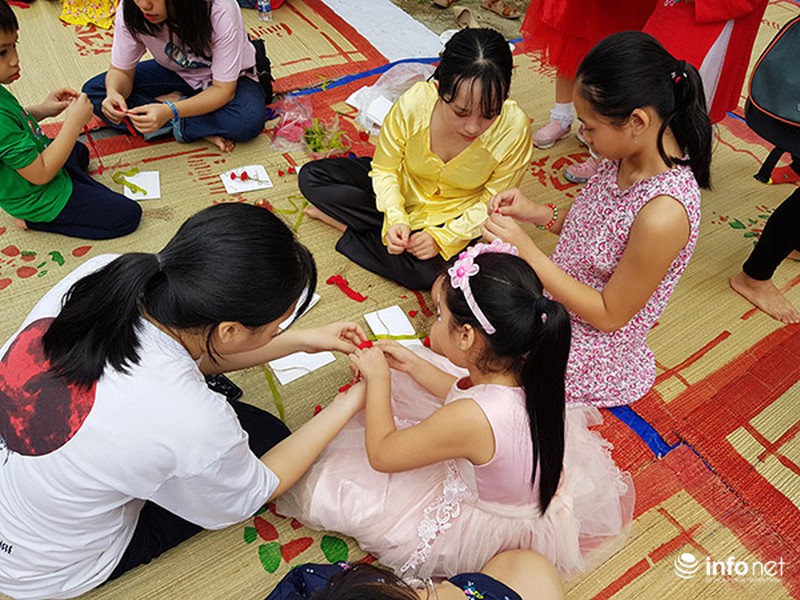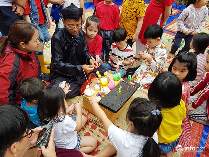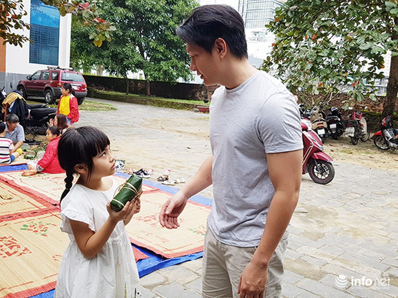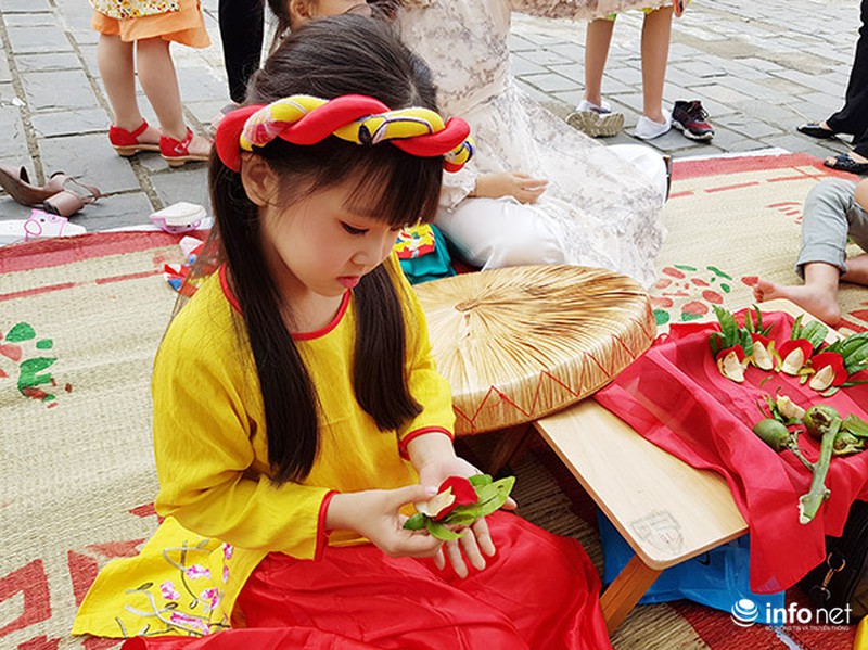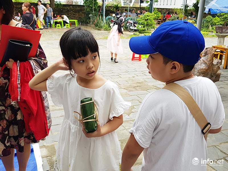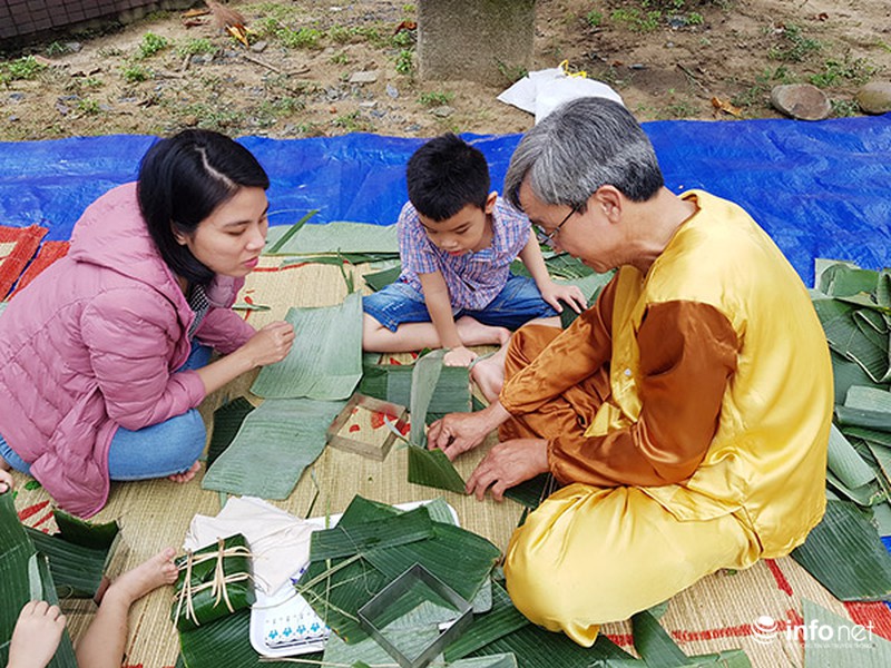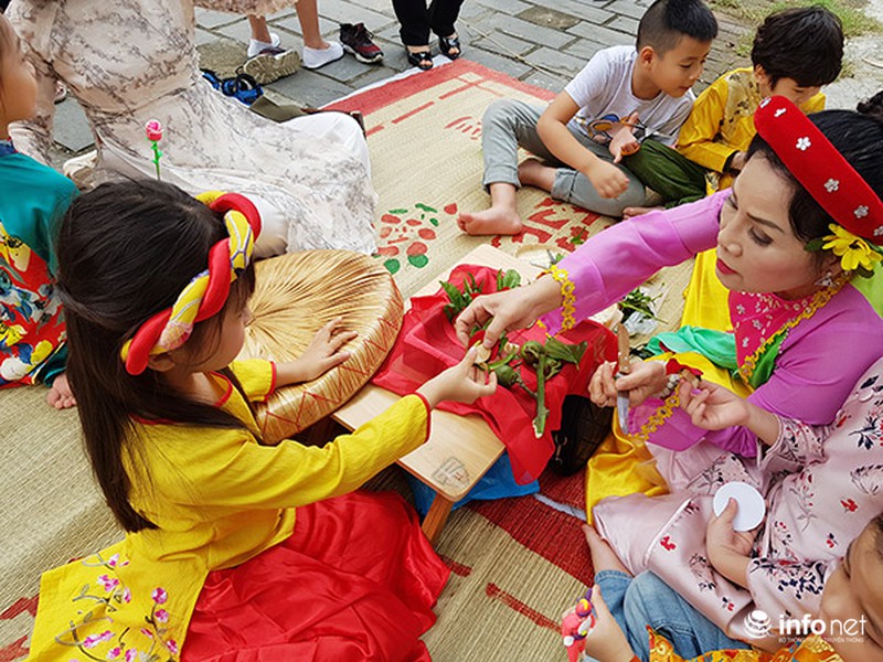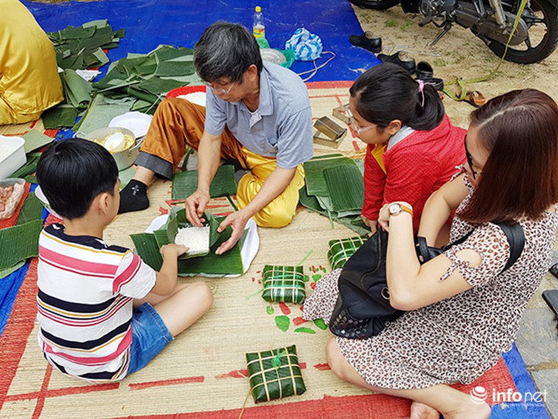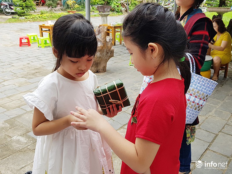 Trẻ em hào hứng học gói bánh chưng truyền thống.