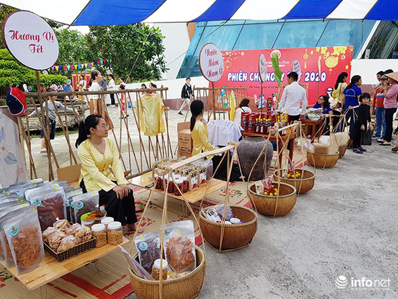 Gian hàng phiên chợ Tếttrưng bày và bán các mặt hàng là sản phẩm đặc trưng của địa phương như: nước mắm Nam Ô, bánh khô mè Cẩm Lệ, bánh tráng Túy Loan, nông sản an toàn, sản phẩm đồ khô, đặc sản Quế Sơn, bánh truyền thống xứ Quảng, hương trầm, trà Việt, hoa giấy và bì lì xì, cây cảnh, đặc sản ẩm thực ngày Tết …