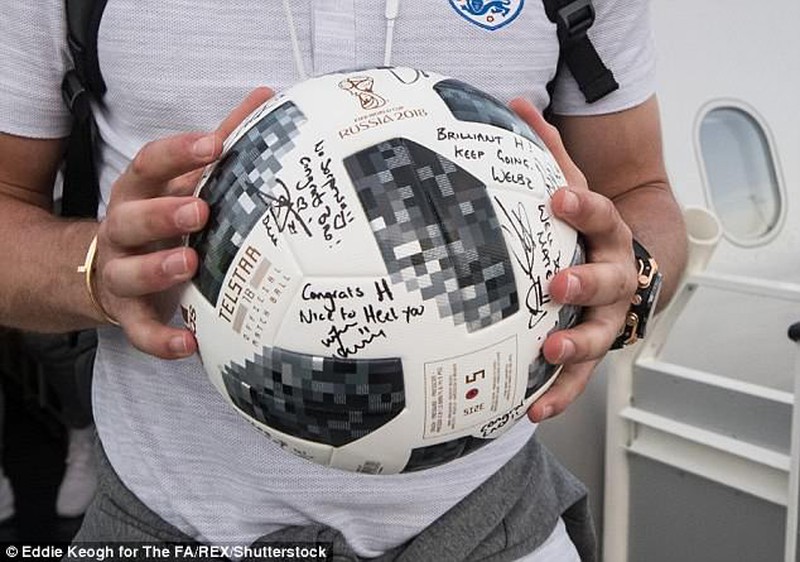 Trên tay anh là quả bóng có chữ ký của các cầu thủ thành viên đội tuyển Anh. Đây là trái bóng được sử dụng cho trận đấu giữa Anh và Panama, và đã được Harry Kane giữ làm kỷ niệm trong trận đấu anh trở thành cầu thủ thi đấu chói sáng với 3 bàn thắng được ghi.