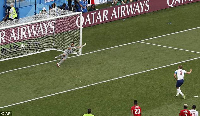 Harry Kane đánh lừa được thủ môn của đội tuyển Panama để sút bóng vào góc trái khung thành. |