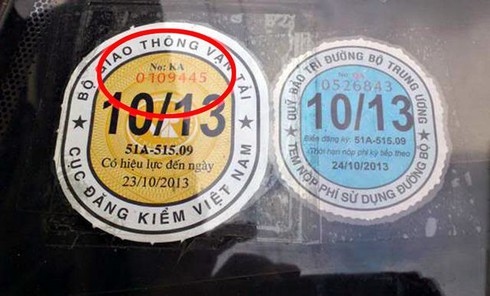 | Phần hiển thị số tem trên chứng nhận đăng kiểm dán ở kính chắn gió trước của ô tô. |