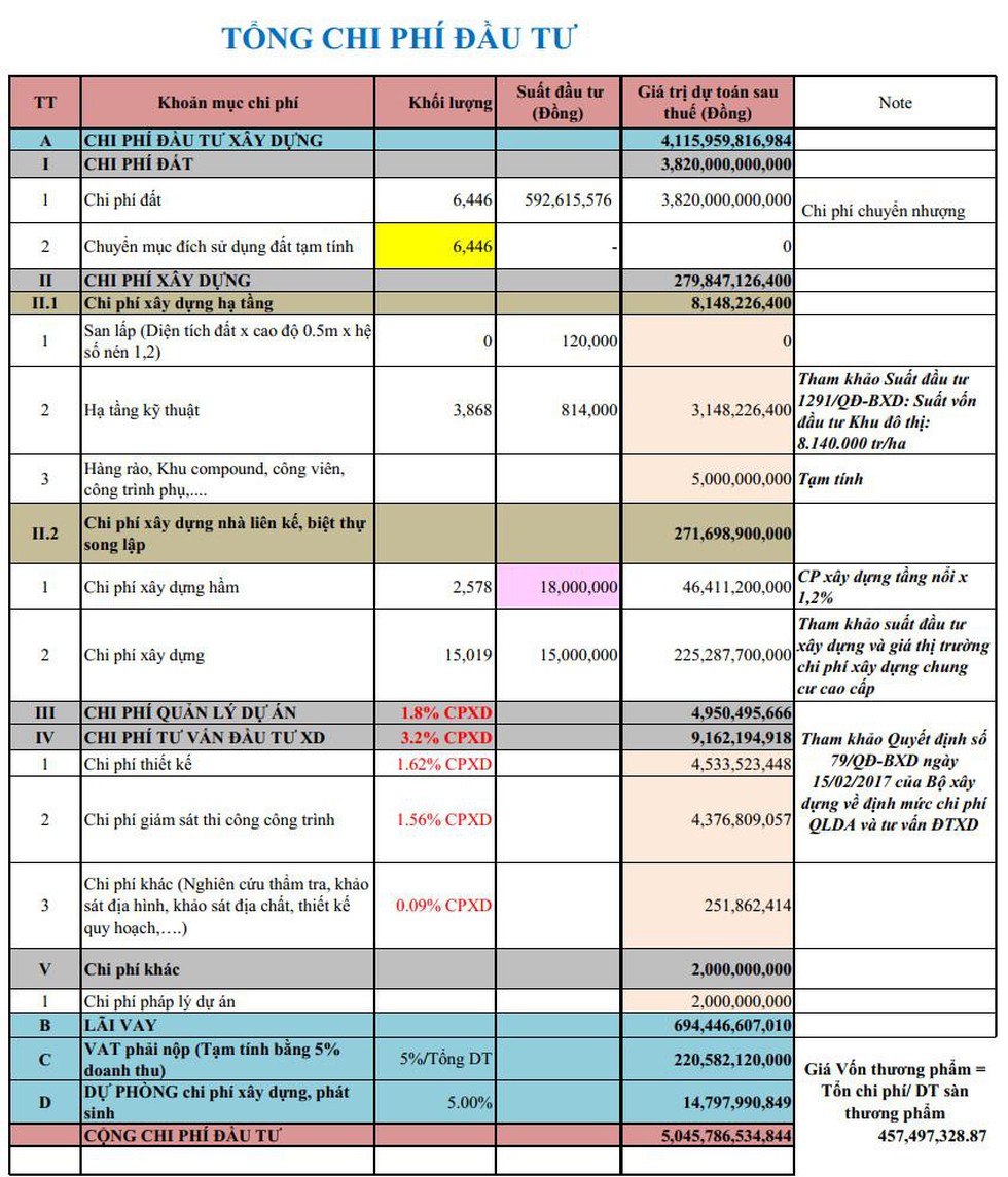 | Tổng chi phí đầu tư xây dựng của dự án chung cư tại lô đất 3-5 do lãnh đạo một doanh nghiệp địa ốc tại TP.HCM tính toán (ảnh: NVCC) |