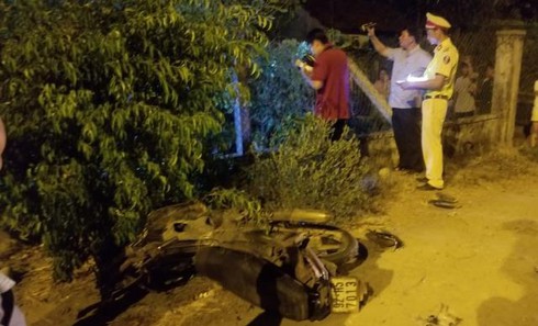 Tại hiện trường, một trụ bê-tông làm hàng rào bị gãy, bên ngoài hàng rào có xe máy biển số: 92H5 – 7013 bị đổ nằm ngay cạnh hàng rào, phần đầu xe bị hư hỏng nặng.