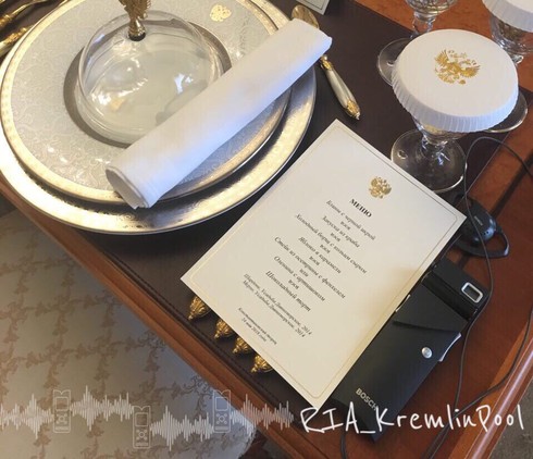 Theo tờ RT, bữa tối của hai nhà lãnh đạo diễn ra tại Cung điện Konstantinovsky, Saint Petersburg. Thực đơn của bữa ăn gồm nhiều món ngon đặc trưng của Nga gồm bánh kếp với trứng cá muối đen, súp củ cải đường với pho mát dê - món ăn người Pháp rất ưa thích, bít tết cá tầm rau thì là và thịt nai hầm atiso.