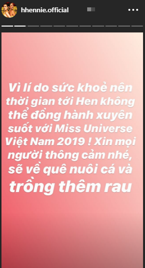 H'Hen Niê còn đùa rằng sẽ về quê nuôi cá và trồng thêm rau: "Vì lí do sức khỏe nên thời gian tới Hen không thể đồng hành xuyên suốt trong Miss Universe Vietnam 2019. Xin mọi người thông cảm nhé, sẽ về quê nuôi cá và trồng thêm rau".