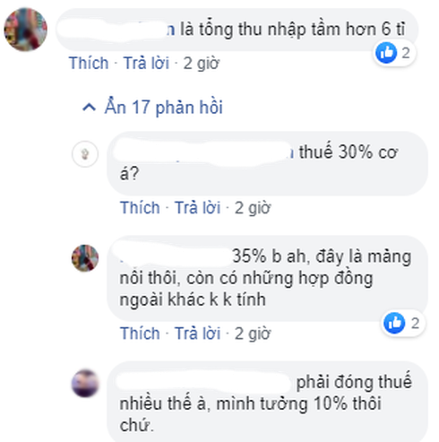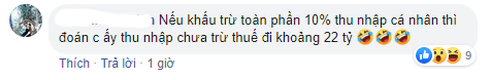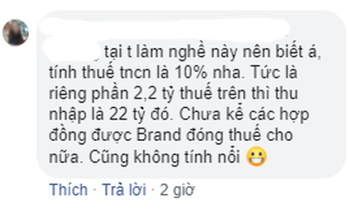 Với số tiền thuế phải đóng này, cư dân mạng đang nhẩm tính thu nhập hằng năm của H'Hen Niê. "Tiền thuế nghệ sĩ 35%, đóng 1 năm là 2 tỷ 2 thì thu nhập tầm 6 tỉ 1 năm là bình thường trong showbiz mà", "Nếu khấu trừ toàn phần 10% thu nhập cá nhân thì đoán chị ấy thu nhập chưa trừ thuế đi là khoảng 22 tỷ", "Tính thuế thu nhập cá nhân là 10% nha. Tức là riêng phần 2,2 tỷ thuế trên thì thu nhập là 22 tỷ đó. Chưa kể các hợp đồng được Brand đóng thuế cho nữa..", cộng đồng mạng nhân lúc rảnh rỗi bàn luận cực kỳ sôi nổi trên diễn đàn showbiz về số tiền mà Hen làm được mỗi năm.