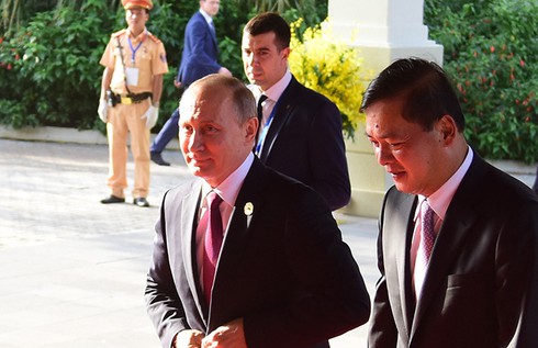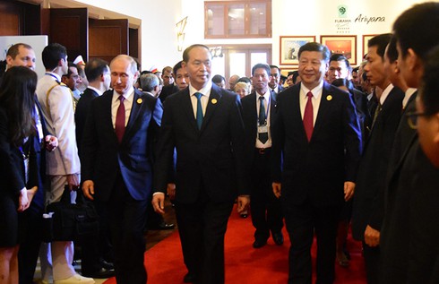 Chủ tịch nước Trần Đại Quang đón Tổng thống Nga Putin và Chủ tịch Trung Quốc Tập Cận Bình. |