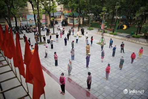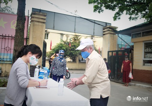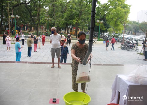 Đến nhận gạo sẻ chia, người dân phải đăng ký, sát trùng tay, đeo khẩu trang và đứng theo ô được đánh dấu sẵn để đảm bảo khoảng cách 2m. |
