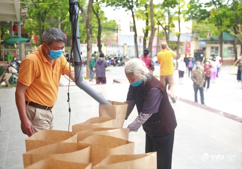 Bà Nguyễn Thị Thi (67 tuổi) chia sẻ: "Tôi đi mua đồng nát, thấy chương trình tuyên truyền trên loa nên ghé vào xem thế nào. Trong những lúc khó khăn thế này, dù chỉ ít gạo nhưng cũng thể hiện tấm lòng "một miếng khi đói bằng một gói khi no".