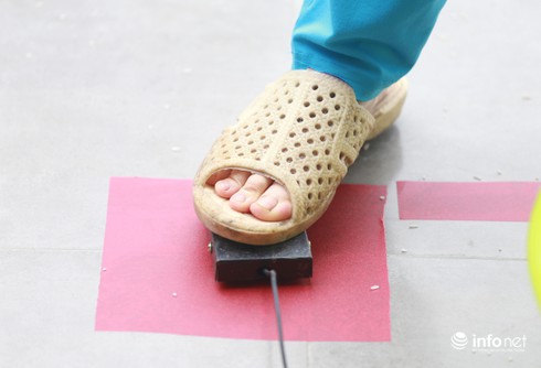 Người dân dùng chân ấn vào bàn đạp, máy sẽ tự động nhả gạo ra. |