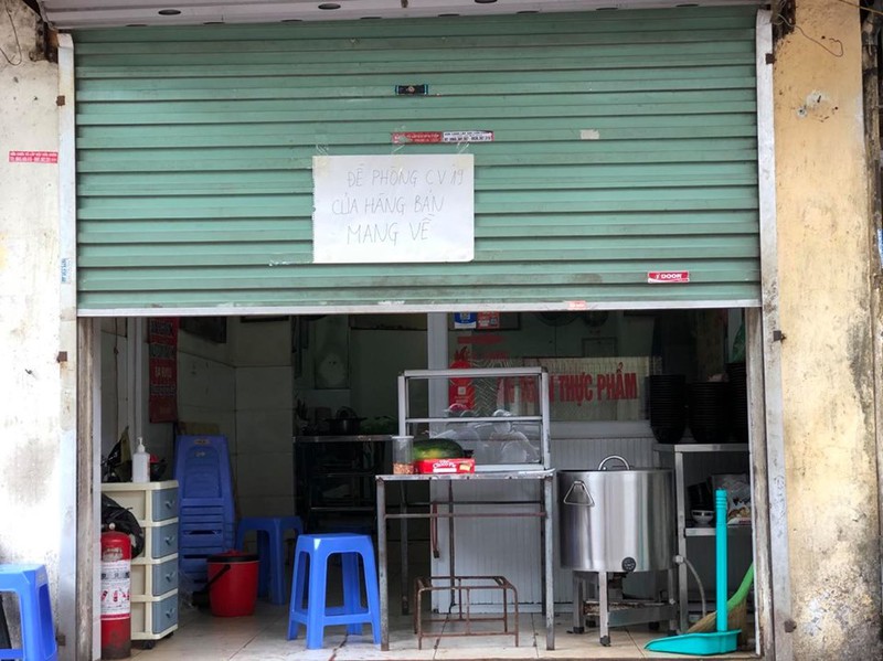 Một cửa hàng khác cũng treo biển thông báo tình trạng hoạt động của mình: "Đề phòng Covid-19, cửa hàng bán mang về" |