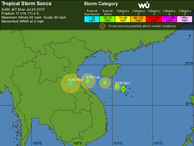 Hồi 10 giờ ngày 24/07, vị trí tâm bão ở vào khoảng 17,3 độ Vĩ Bắc; 111,1 độ Kinh Đông, cách đảo Hải Nam (Trung Quốc) khoảng 160km về phía Đông Nam. Sức gió mạnh nhất ở vùng gần tâm bão mạnh cấp 8 (60-75km/giờ), giật cấp 9-10.