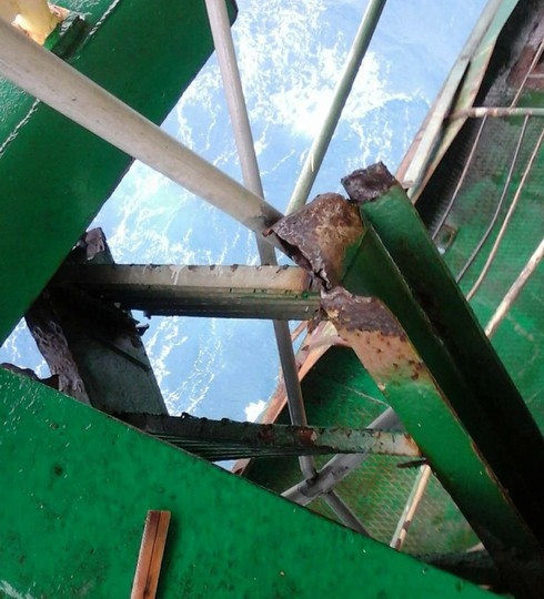Đoạn cầu thang từ sàn dầu lên nhà ở DK1/14 (nhà cũ) đã bị đánh bật tung, từ đây xuống mặt biển còn 17m. |