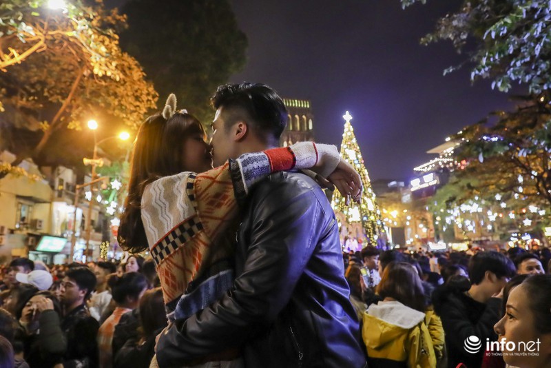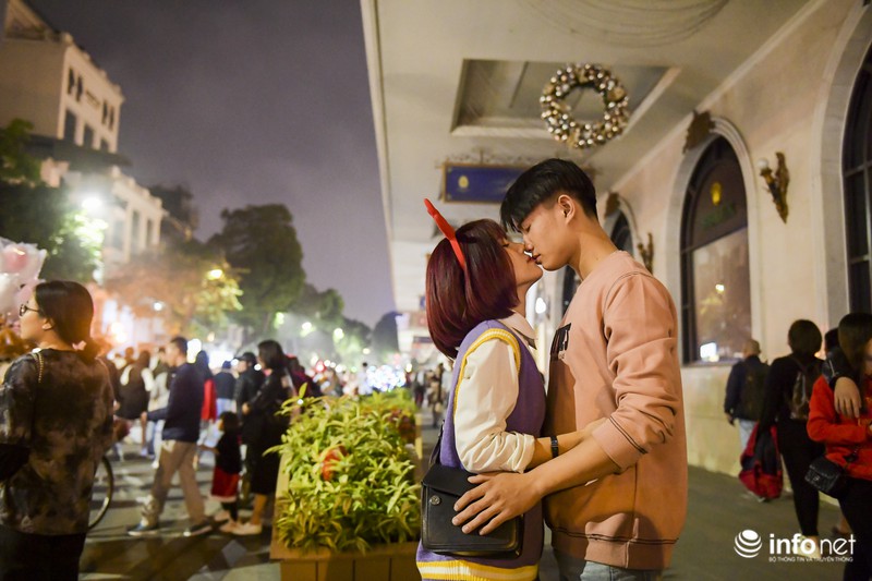 Đặc biệt, nhiều đôi bạn trẻ không ngần ngại trao nhau nụ hôn lãng mạn, ngọt hơn những viên kẹo trong đêm Giáng sinh. |
