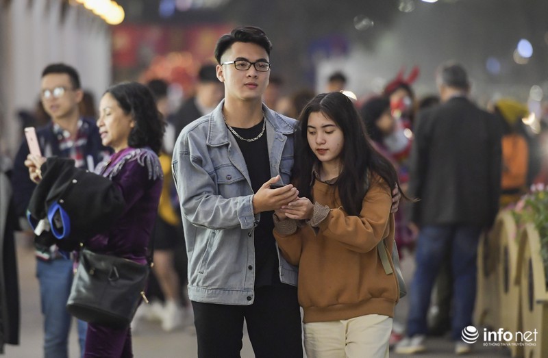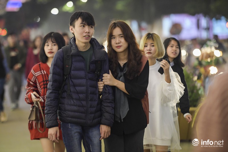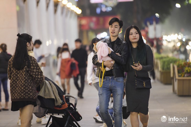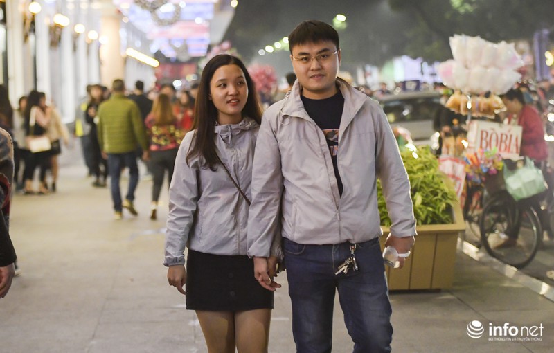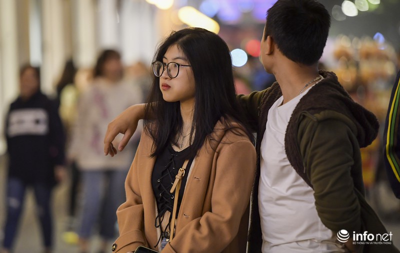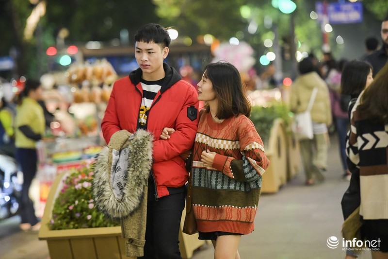Thời tiết Hà Nội về đêm khoảng 18 độ C, rét nhưng không mưa nên càng khiến các bạn trẻ thích thú xuống đường đi chơi. |