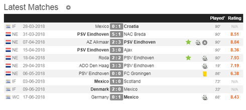 Kết quả các trận gần nhất của đội tuyển Mexico và CLB PSV mỗi khiLozano ra sân. |
