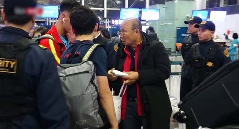 Tại sân bay Nội Bài tối 13/12, thấy Tiến Linh cầm túi quà được tặng, HLV Park Hang Seo bèn xem bên trong có những gì.