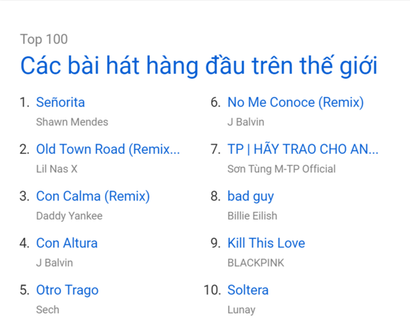 Mới đây, Youtube vừa công bố hai bảng xếp hạng (BXH) bài hát và MV có lượt phát nhiều nhất trong tuần qua trên toàn thế giới với sự góp mặt của nhiều tên tuổi đình đám của châu Á và Hollywood. Điều đáng nói ở đây, Sơn Tùng là gương mặt duy nhất của Vpop xuất hiện trong cả hai BXH này. Ở mảng top 10 bài hát được phát nhiều nhất, “Hãy trao cho anh” giữ vị trí thứ 7 trên toàn thế giới. |