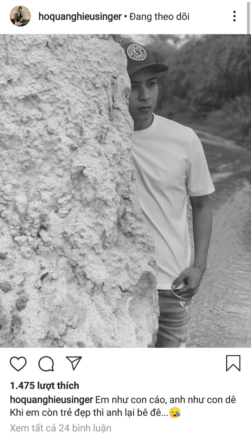 Trên mạng xã hội Instagram, Hồ Quang Hiếu tự nhận mình là... bê đê khi anh chia sẻ dòng trạng thái “Em như con cáo, anh như con dê. Khi em còn trẻ và đẹp thì anh lại là… bê đê”. Tuy nhiên dưới phần bình luận anh đã kịp giải thích với fans rằng mình chỉ đang đùa thôi. |