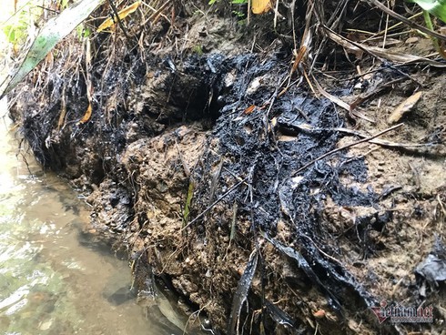 | Dầu thải bám hai bên bờ suối gần nhà máy nước sạch sông Đà. Ảnh: Bách Trần |