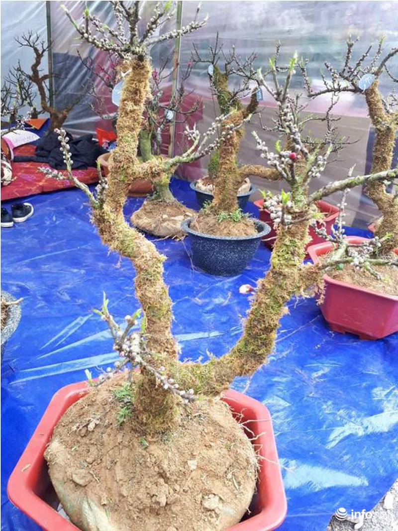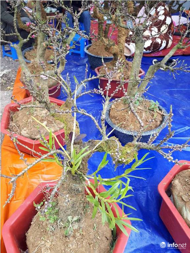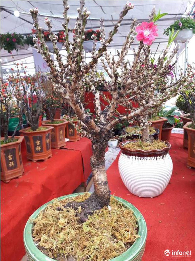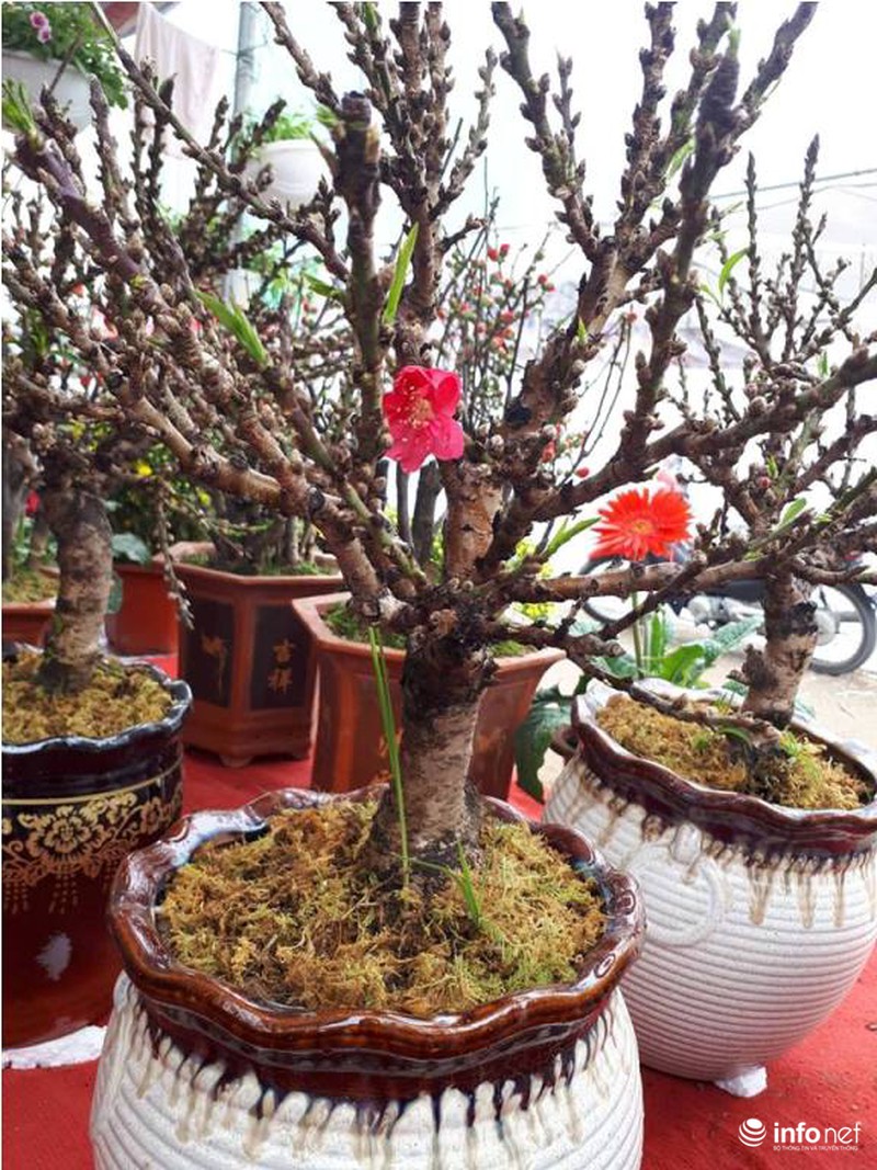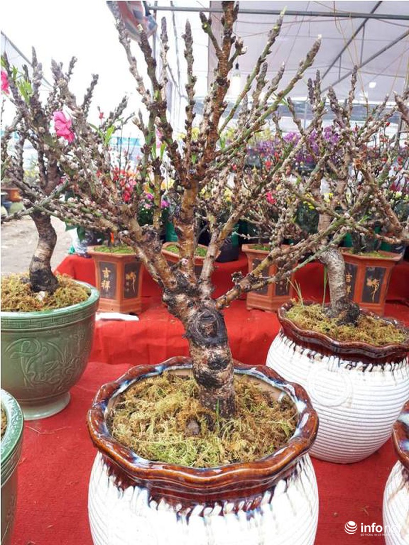 Tại một gian hàng khác, cây đào mini cao khoảng 30 đến 70 cm có gốc mập, nhẵn, cành thẳng, mắt nụ dày, nhiều hoa và lộc có giá bán dao động từ 3-4 triệu đồng. |