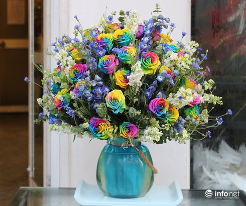 Bình hoa gồm 100 hoa hồng rainbow và hoa đồng nội, giá bán 20 triệu đồng. |