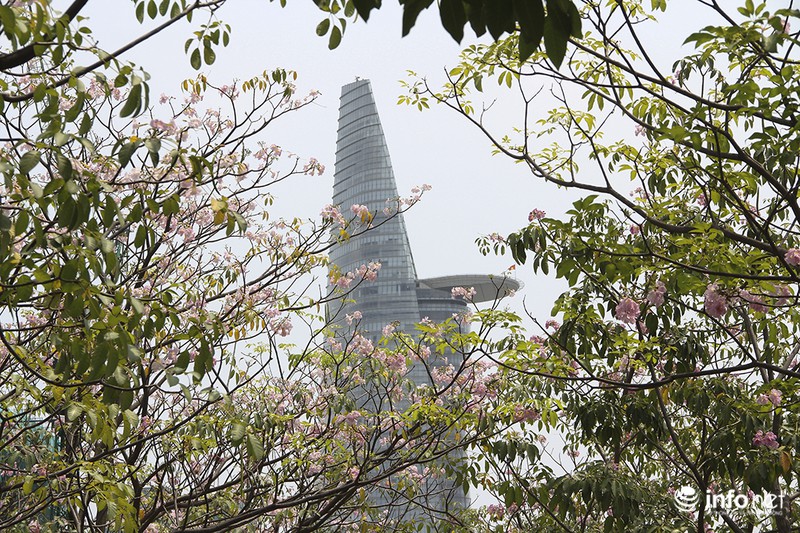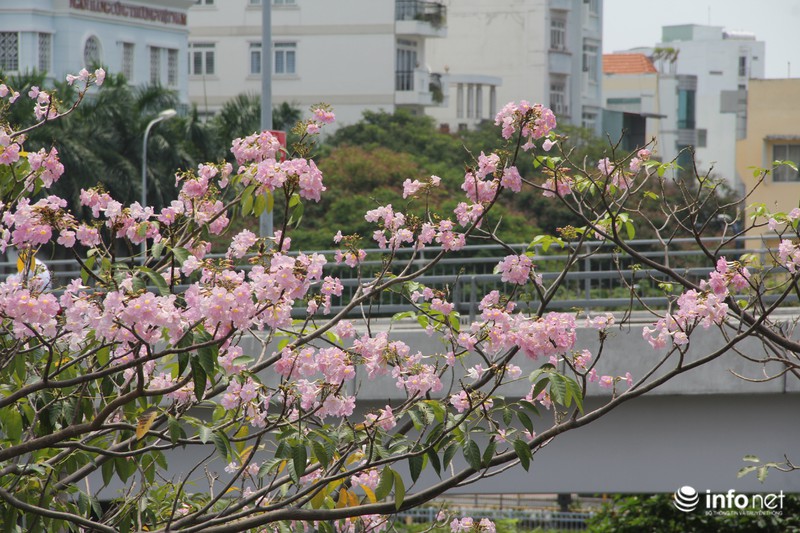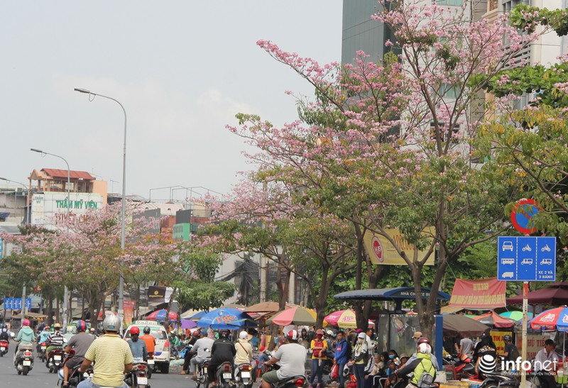 Những ngày này, thời tiết tại TP.HCM nắng nóng và oi bức, nhưng những đóa kèn hồng lại bung nở rực rỡ. |