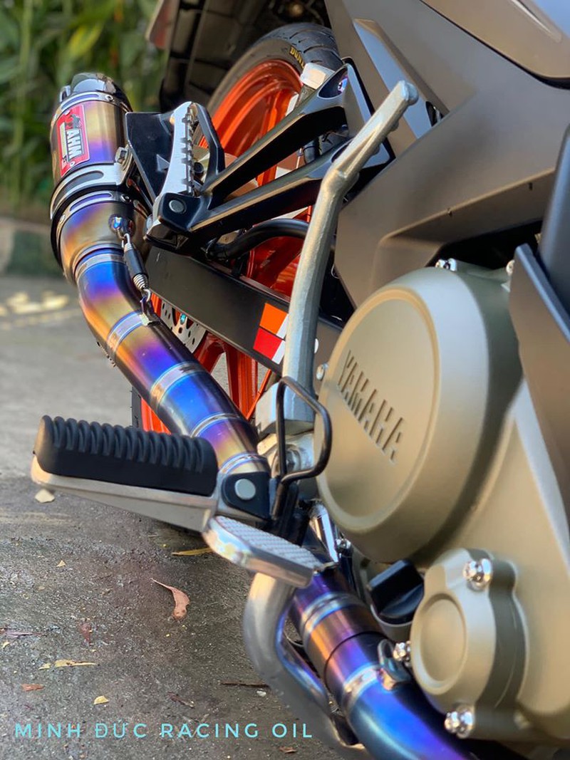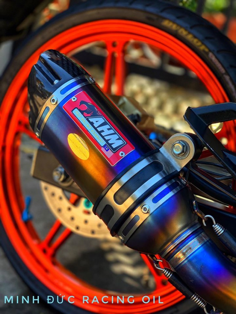 'Hơi thở' sử dụng pô AHM M3 Titan FullSystem kết hợp cùng cổ Titan cho âm thanh uy lực hơn khi chiếc xe bay tốc độ cao. Xung quanh phần lốc máy là những chú ốc Inox đầu Salaya sáng bóng khá nổi bật. |