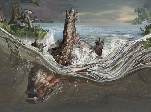 Minh họa xác khủng long nodosaur bị cuốn trôi ra biển. (Ảnh: National Geographic). |