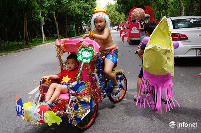 Các em nhỏ cùng với bố mẹ mình đã tự tay “biến hóa” những chiếc xe đạp hay xích lô trở thành xe tôm, cua, cá, bạch tuộc ngộ nghĩnh. |