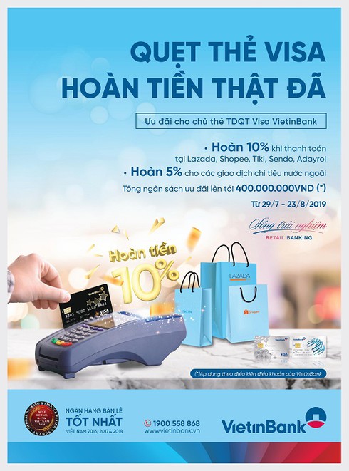 Tham gia chương trình khuyến mãi, khách hàng thỏa sức lướt web, mua sắm online nhanh chóng - tiện lợi, lại được hoàn 10% (tối đa 250.000 đồng/khách hàng/tuần) với giao dịch từ 1.000.000 đồng bằng thẻ Visa VietinBank tại các website Lazada.vn, Shopee.vn, Tiki.vn, Sendo.vn, Adayroi.com.
