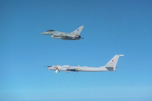 Máy bay chiến đấuTyphoon của Không quân Hoàng gia Anh hộ tống Tu-142. Ảnh: RIA. |