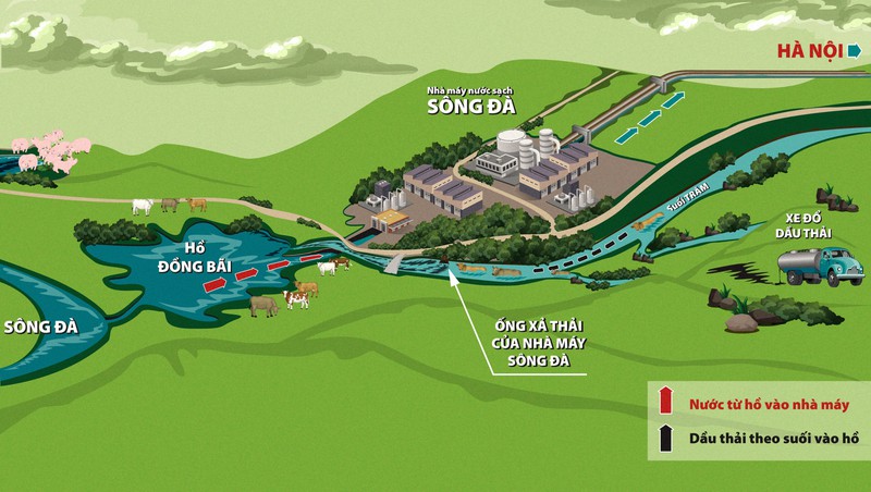 Không chỉ dính dầu thải, suối Trâm – đổ vào hồ Đồng Bài còn hứng cả nước thải của chính nhà máy nước sạch sông Đà (đồ họa).