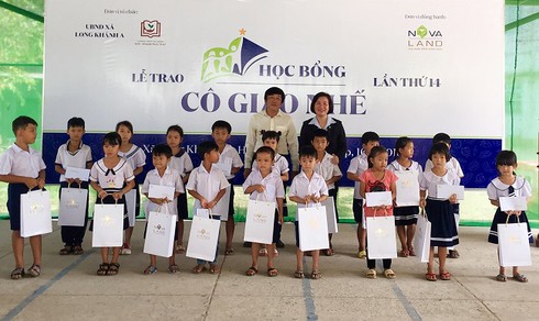 Đại diện Tập đoàn Novaland và lãnh đạo địa phương trao học bổng đến các em học sinh hiếu học. |