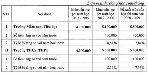 Hiện tại, mức thu của các trường được thực hiện theo Nghị quyết số 14/2016/NQ-HĐND năm 2016 của HĐND thành phố quy định mức trần học phí đối với các cơ sở giáo dục công lập chất lượng cao năm học 2019-2020. Cụ thể, cấp học mầm non và tiểu học có mức trần học phí là 5,1 triệu đồng/tháng; cấp THCS và THPT là 5,3 triệu đồng/tháng.
