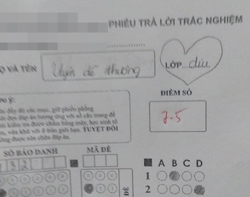 Cụ thể, trong bài kiểm tra môn Tin học, một học sinh đã cả gan "thả thính" giáo viên ngay cưới bài kiểm tra với dòng chữ "yêu người chấm bài" và vẽ hình trái tím.