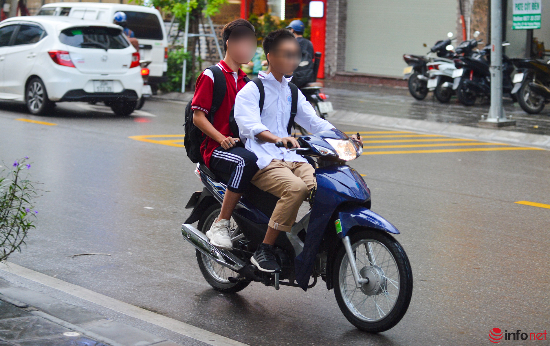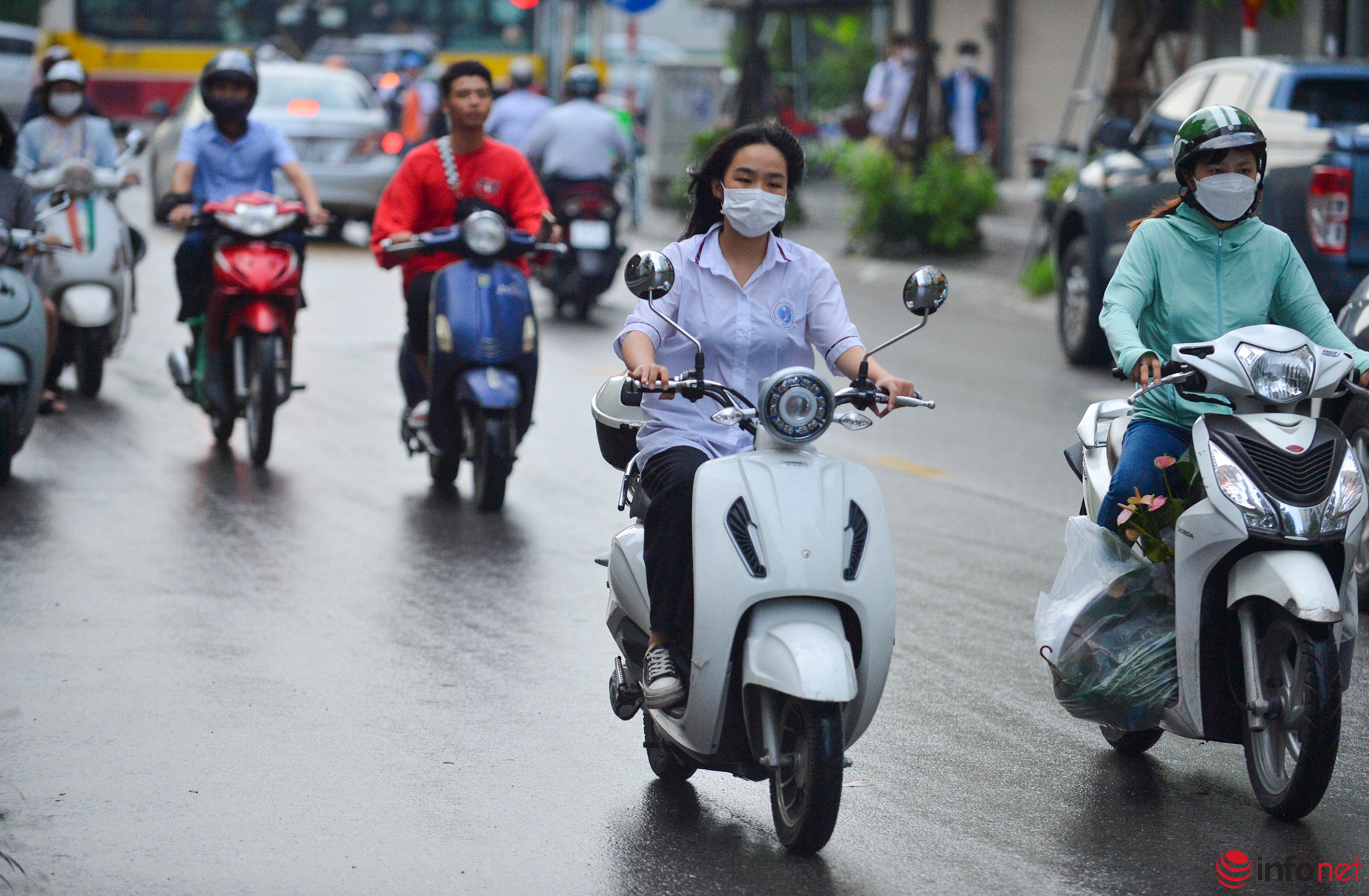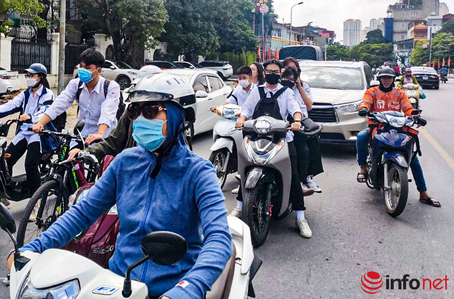 Hà Nội: Nhiều học sinh vẫn không đội mũ bảo hiểm khi điều khiển xe máy, dàn hàng 2, hàng 3