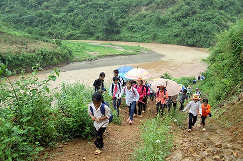 Học sinh bản Nà Ui phải băng rừng, vượt suối đến trường kịp khai giảng năm học mới. |