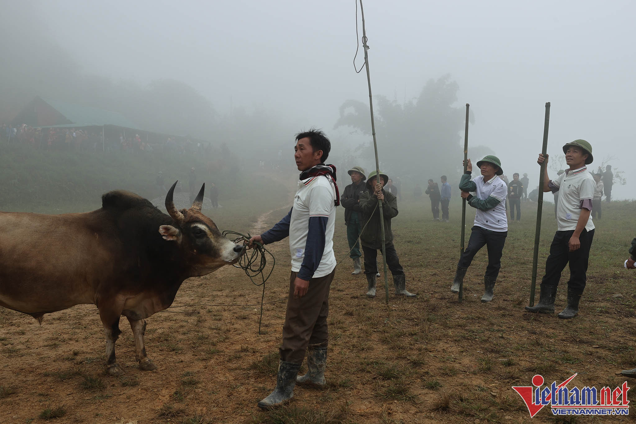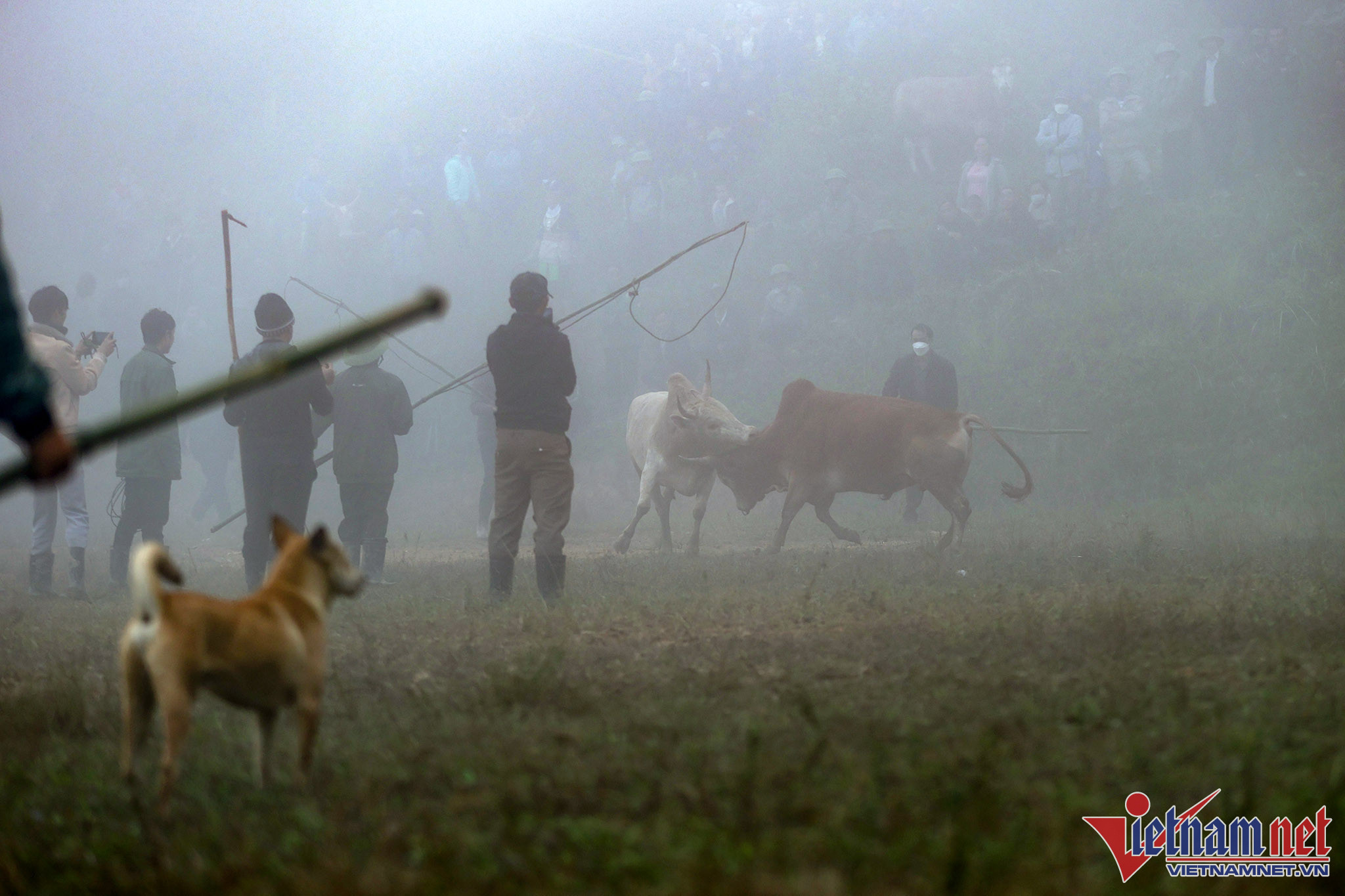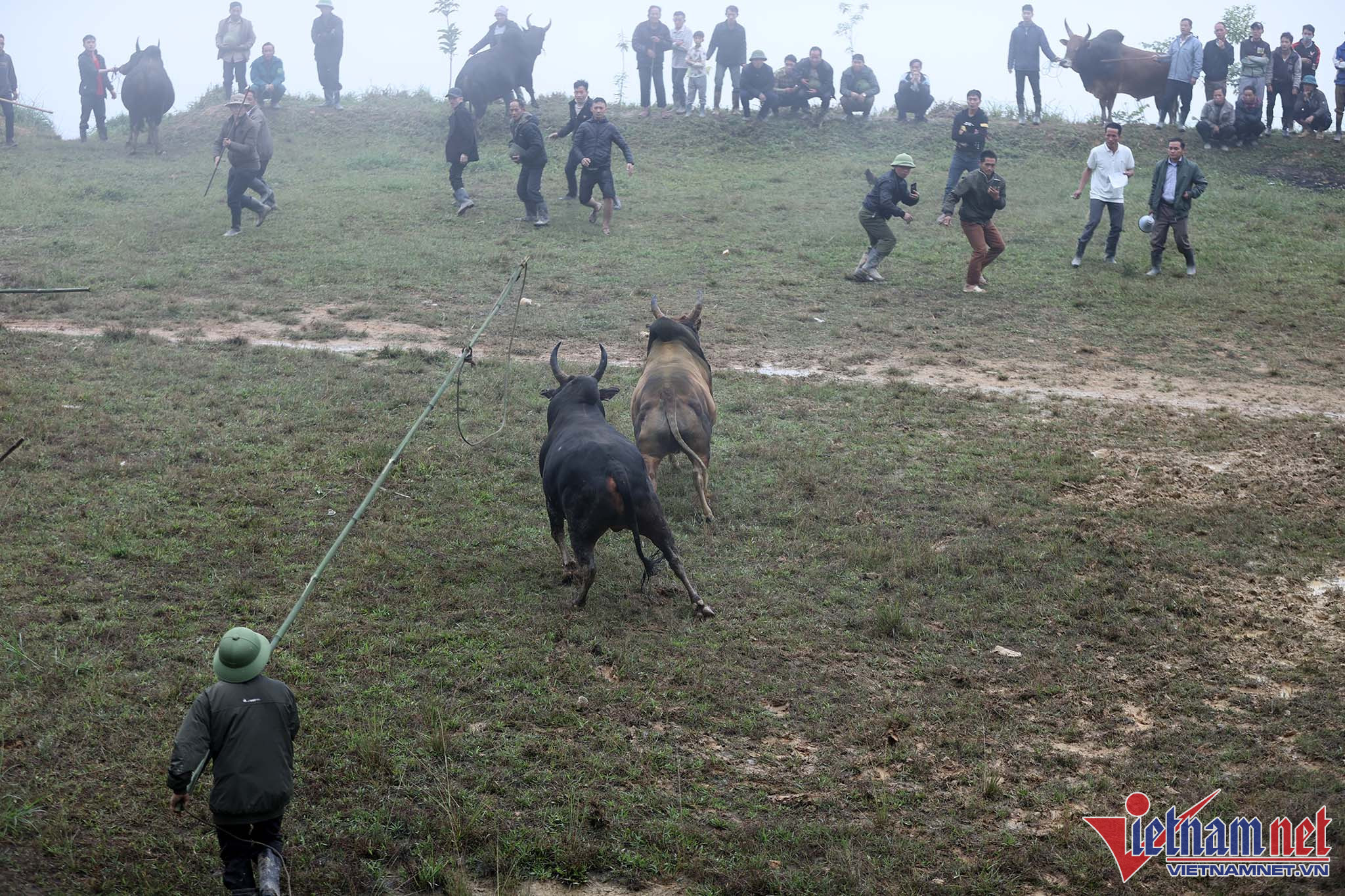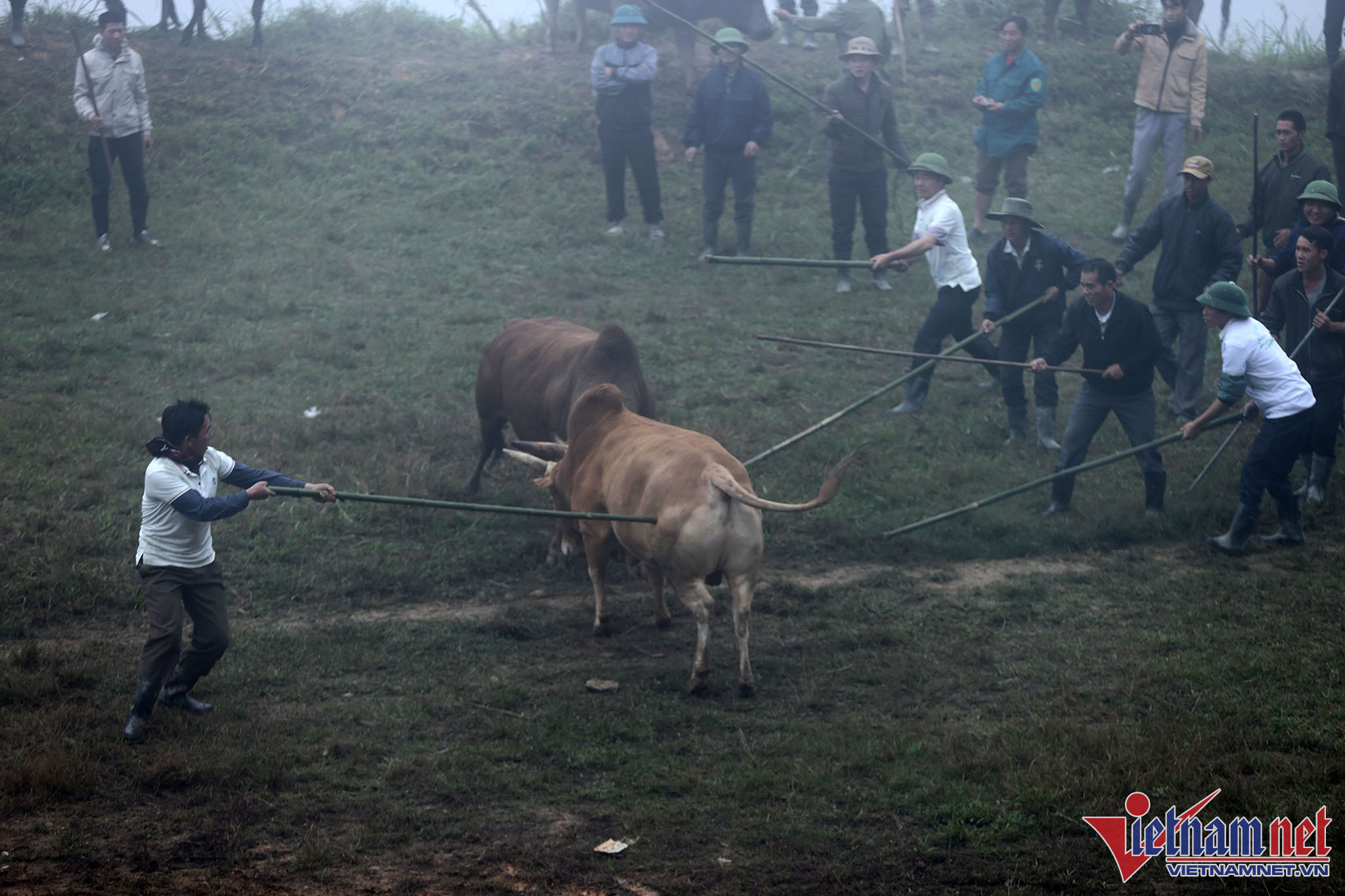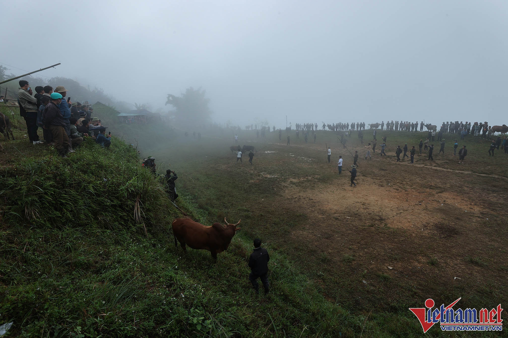 Bãi chọi thường là khoảng cỏ rộng hoặc là những thửa ruộng bằng phẳng liền nhau vừa thu hoạch lúa. Ngay từ sáng sớm, bà con đã tụ tập đông đủ với trang phục màu sắc sặc sỡ đổ về khu vực chọi bò.Anh Xồng Chong Vừ, thành viên ban tổ chức "hội bò chận" nhân dịp tổng kết cuối năm 2022 đọc tên những mạnh thường quân tài trợ tiền cho "hội bò chận". Người dân đi xem chọi bò thường tự đóng góp tiền cho cuộc vui tùy theo điều kiện kinh tế.Người dân từ các địa phương lân cận đến xem "hội bò chận" từ sáng sớm.Nhiều hộ gia đình trang sức cho bò bằng những vòng cổ rực rỡ sắc màu.Hàng chục tráng niên trang bị gậy tre dài để bắt giữ bò, tránh trường hợp bò chạy đuổi nhau ra khỏi bãi chọi.Những chiếc sào tre có dây thòng lọng dùng để quàng cổ, khống chế bò.Chiếc gậy với cái móc này dùng để móc vào vòng sắt trên mũi, giúp khống chế bò trong trường hợp bò làm loạn trường đấu.Thường các cặp bò chọi khi vào bãi thường được chủ kéo sao cho 2 bò đối đầu để kích thích bò chọi.Người dân tại đây cho biết, "hội bò chận" không có giải thưởng hoặc chỉ tượng trưng.Tuy nhiên, nếu con bò nào chết thì chủ bò được người dân đóng góp tiền để người chủ mua con khác tiếp tục tham những hội chọi sau. Bò thua chạy rất hoảng loạn và gây nguy hiểm cho người xem.Ban tổ chức chọn ra một đội trọng tài kiêm luôn bảo vệ mỗi khi bò làm loạn trường đấu. Chỉ sau khi móc được chiếc vòng khuyên trên mũi con bò mới hoàn toàn bị khống chế và hết hung dữ.Đi từ 6 giờ sáng, sau 2 trận đấu, con bò của gia đình chị Vừ Y Sành toàn thắng nhưng theo quy định của hội bò sẽ không được thi đấu tiếp nếu thắng liền 2 trận.Kinh nghiệm của nhiều người ở đây cho biết: Muốn cho bò thi đấu hăng, rất cần sự cổ vũ của người xem, cổ vũ càng mạnh thì bò thi đấu càng hăng.Đồng bào người H'Mông luôn xem chọi bò là một nét đẹp văn hóa. Mỗi trận đấu diễn ra là một ngày hội của dân làng khắp trong bản ngoài mường.Ông Lầu Chống Sử nhà ở bản Pha Sắc địu cháu nội đến xem "hội bò chận" từ 6 giờ sáng.