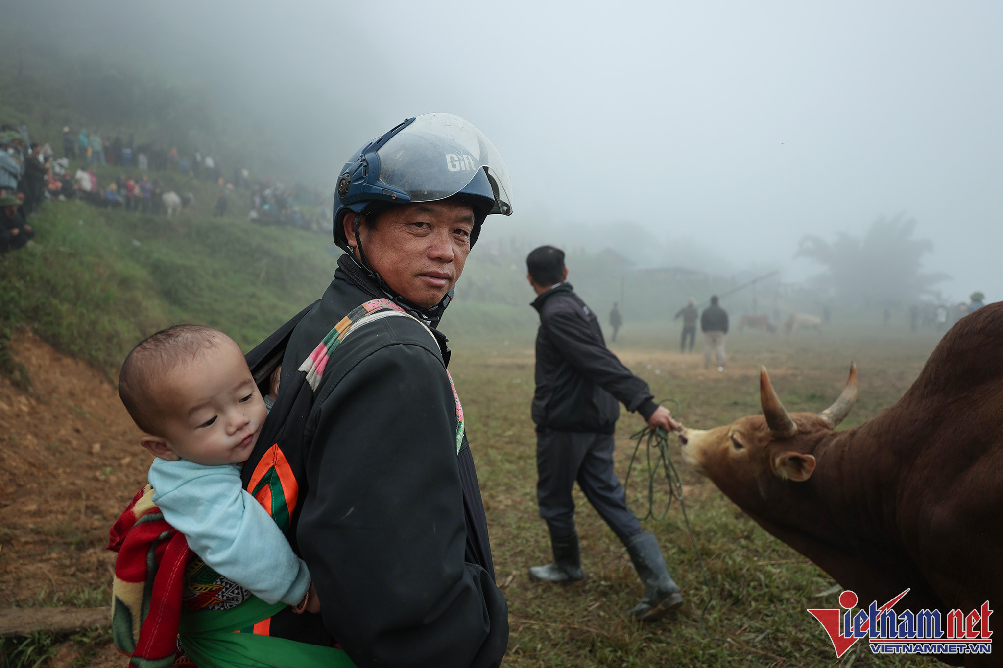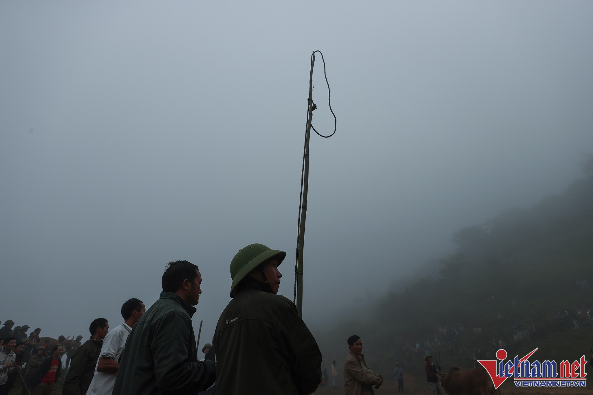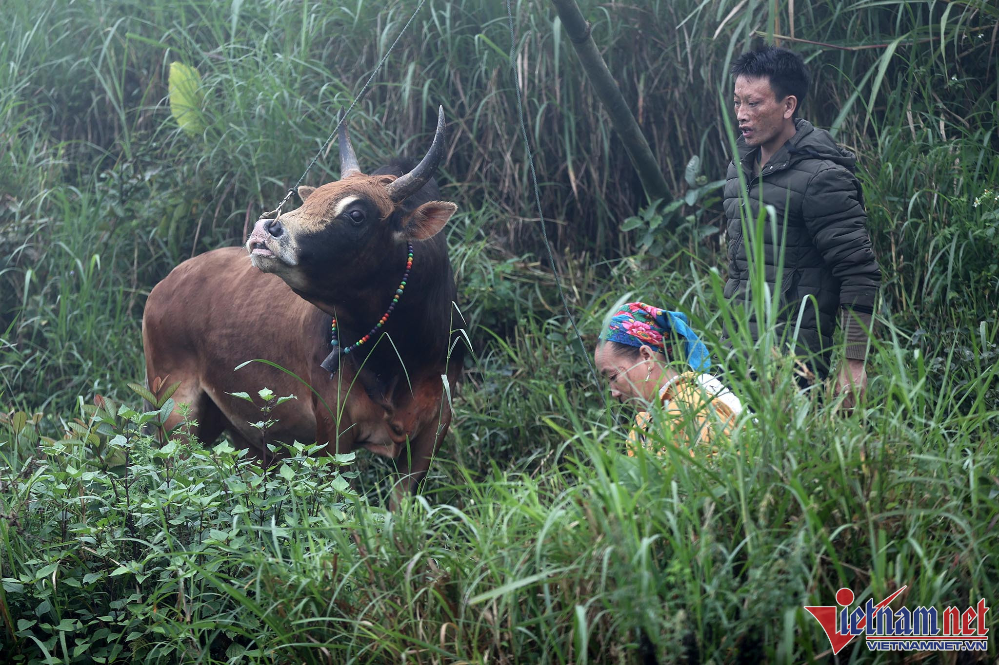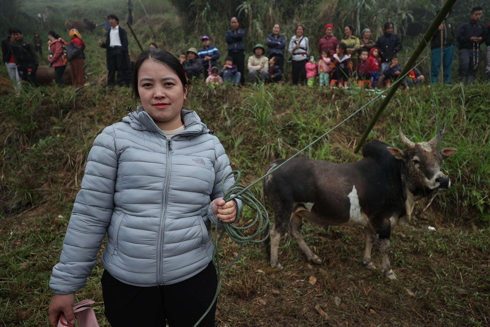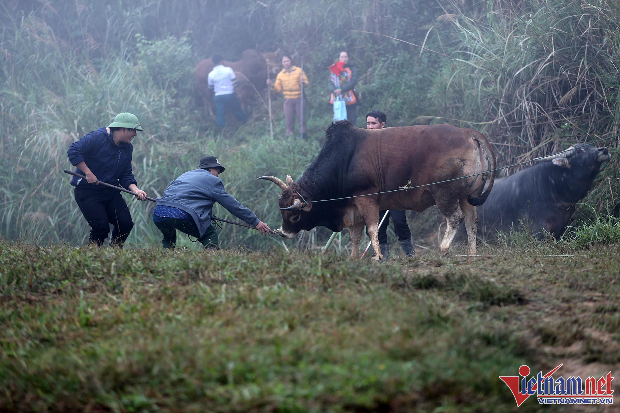 Bãi chọi thường là khoảng cỏ rộng hoặc là những thửa ruộng bằng phẳng liền nhau vừa thu hoạch lúa. Ngay từ sáng sớm, bà con đã tụ tập đông đủ với trang phục màu sắc sặc sỡ đổ về khu vực chọi bò.Anh Xồng Chong Vừ, thành viên ban tổ chức "hội bò chận" nhân dịp tổng kết cuối năm 2022 đọc tên những mạnh thường quân tài trợ tiền cho "hội bò chận". Người dân đi xem chọi bò thường tự đóng góp tiền cho cuộc vui tùy theo điều kiện kinh tế.Người dân từ các địa phương lân cận đến xem "hội bò chận" từ sáng sớm.Nhiều hộ gia đình trang sức cho bò bằng những vòng cổ rực rỡ sắc màu.Hàng chục tráng niên trang bị gậy tre dài để bắt giữ bò, tránh trường hợp bò chạy đuổi nhau ra khỏi bãi chọi.Những chiếc sào tre có dây thòng lọng dùng để quàng cổ, khống chế bò.Chiếc gậy với cái móc này dùng để móc vào vòng sắt trên mũi, giúp khống chế bò trong trường hợp bò làm loạn trường đấu.Thường các cặp bò chọi khi vào bãi thường được chủ kéo sao cho 2 bò đối đầu để kích thích bò chọi.Người dân tại đây cho biết, "hội bò chận" không có giải thưởng hoặc chỉ tượng trưng.Tuy nhiên, nếu con bò nào chết thì chủ bò được người dân đóng góp tiền để người chủ mua con khác tiếp tục tham những hội chọi sau. Bò thua chạy rất hoảng loạn và gây nguy hiểm cho người xem.Ban tổ chức chọn ra một đội trọng tài kiêm luôn bảo vệ mỗi khi bò làm loạn trường đấu. Chỉ sau khi móc được chiếc vòng khuyên trên mũi con bò mới hoàn toàn bị khống chế và hết hung dữ.Đi từ 6 giờ sáng, sau 2 trận đấu, con bò của gia đình chị Vừ Y Sành toàn thắng nhưng theo quy định của hội bò sẽ không được thi đấu tiếp nếu thắng liền 2 trận.Kinh nghiệm của nhiều người ở đây cho biết: Muốn cho bò thi đấu hăng, rất cần sự cổ vũ của người xem, cổ vũ càng mạnh thì bò thi đấu càng hăng.Đồng bào người H'Mông luôn xem chọi bò là một nét đẹp văn hóa. Mỗi trận đấu diễn ra là một ngày hội của dân làng khắp trong bản ngoài mường.Ông Lầu Chống Sử nhà ở bản Pha Sắc địu cháu nội đến xem "hội bò chận" từ 6 giờ sáng.